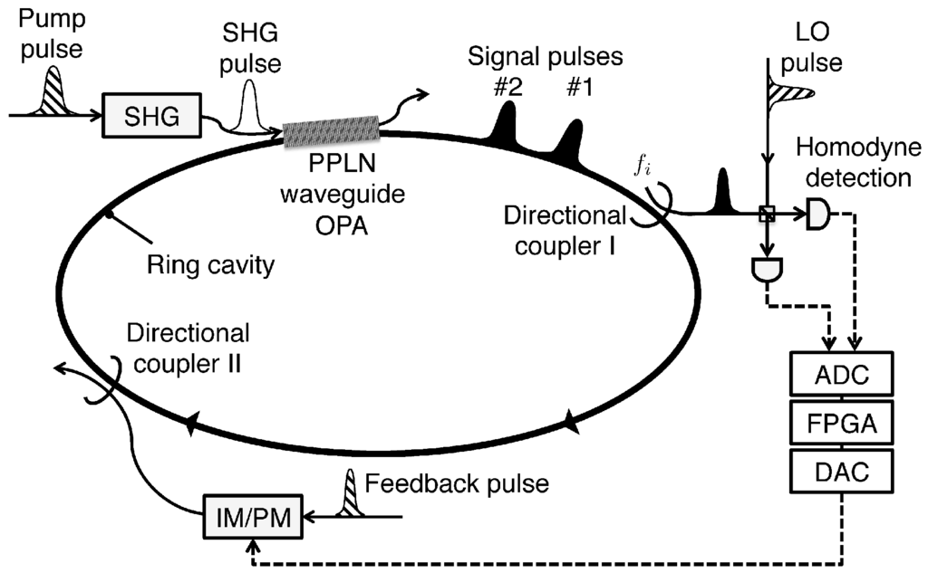 When we wish to build a large-scale experimental system of CIM, one serious problem is how to stabilize all optical delay lines for mutual injection paths. An alternative way is quantum measurement-based mutual coupling scheme, which is shown in Figure 5. A fiber ring resonator is composed of three components: an optical parametric amplifier and two directional couplers. These directional couplers I and II are used as an out-coupling port to the optical homodyne detectors and feedback signal injecting port for providing the mutual coupling between the DOPO pulses, respectively. Instead of directly connecting the DOPO pulses with optical delay lines, we can measure the in-phase amplitude of the j-th pulse and compute the proper feedback pulse amplitude for the i-th pulse by the digital electronic circuit, where the coupling coefficient is proportional to the Ising coupling . The output electrical signal drives the intensity and phase modulators to properly generate a feedback pulse for the i-th pulse. To synchronously calculate this matrix-vector product in each cavity round trip, a field programmable gate array (FPGA) or application specific integrated circuit (ASIC) can be installed. Such a hybrid optoelectronic coupling scheme is equivalent to the purely optical coupling scheme except for the small difference in noise penalty.