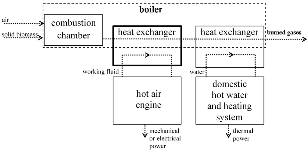 Solid biomass-fuelled micro-CHP systems are composed of a solid biomass-fuelled boiler and a cogeneration device supplied by means of a heat exchanger to produce mechanical or electrical energy (cf. Figure 1). The literature mentions several solid biomass-fuelled micro-CHP systems associated to various cogeneration devices: a Stirling hot air engine [,,,], an Organic Rankine Cycle (ORC) turbine [] and a thermoelectric generator []. Although no study has dealt with the performances of a solid biomass-fuelled micro-CHP system with an Ericsson hot air engine yet, this cogeneration device is well adapted in such facilities []. The Ericsson engine thermal efficiency can reach 52% []. Contrary to other hot air engines, the Ericsson engine does not necessarily require a cold source as it can work with an open cycle as chosen in the present study. In this case, low pressure levels are needed, leading to a less compact engine.