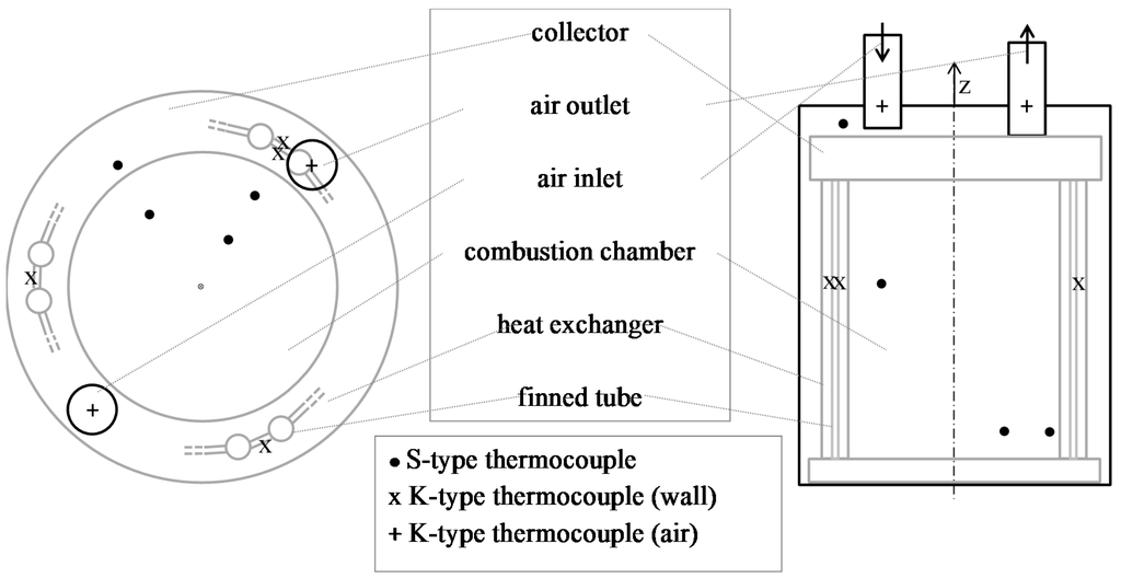 The flue gas temperatures are measured with 0.2 mm diameter S-type thermocouples (measurement error of 0.25%) that can be positioned at several vertical and radial positions (cf. Figure 4). To estimate the measurement error linked to radiative flux inside the combustion chamber, the extrapolation method is used: the temperatures are measured simultaneously with two thermocouples of different diameters (0.2 mm and 0.13 mm). With a temperature of 600 °C without correction, the measurement error is estimated to 44 °C and can reach 187 °C for a flue gas measured temperature of 1000 °C (mainly because of the hot junction radiative losses).
