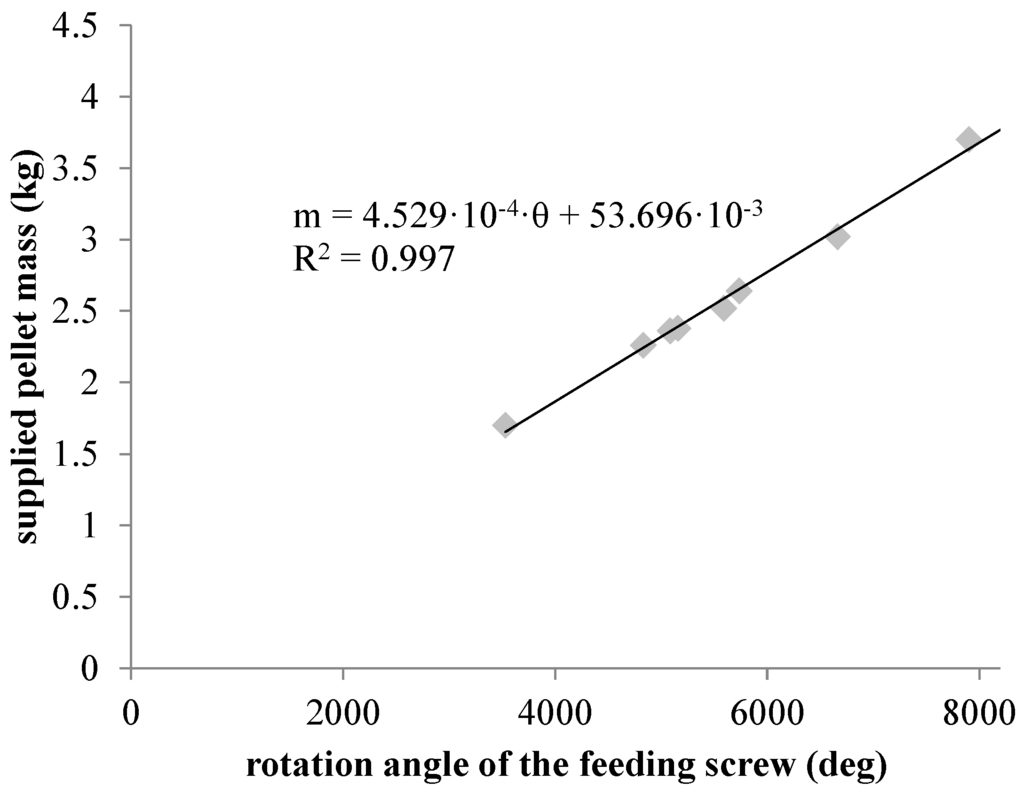 The flue gas mass flow rate is estimated from the biomass fuel mass flow rate burned and from the combustion equation. The boiler is supplied with wood pellets using a screw conveyor instrumented with a magnetic sensor measuring the angular position. A calibration of the screw links its angular rotation to the mass of pellets supplied in the boiler (cf. Figure 5). From an elementary analysis of wood pellets, the combustion equation is established, considering an air excess λair of 0.8 []: