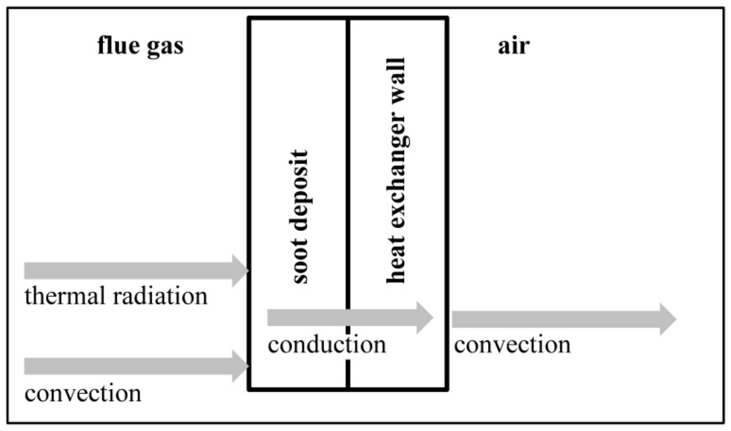 The heat transfer across the heat exchanger inserted in the solid biomass-fuelled boiler of the micro-CHP system depends on several thermal phenomena: conduction, convection and thermal radiation (cf. Figure 6). In particular, the flue gas from solid biomass combustion at high temperature and containing soot particles generates an important thermal radiation and induces fouling on the heat exchanger wall that modifies the conduction through the wall (presence of a soot deposit) [].