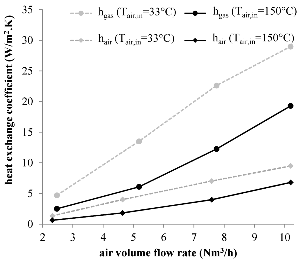 with the average flue gas temperature in the heat exchanger. The experimental heat transfer coefficients of Equations (19) and (20) depending on air volume flow rate for several inlet air temperatures are presented in Figure 9. The convective heat transfer coefficient on the side of air is lower than the convective and radiative heat transfer coefficient on the side of flue gas, so that the convection phenomenon between the heat exchanger wall and the air is the first limitation to the global heat transfer in the heat exchanger. This result corroborates the conclusions of the energetic study of the heat exchanger presented in [].