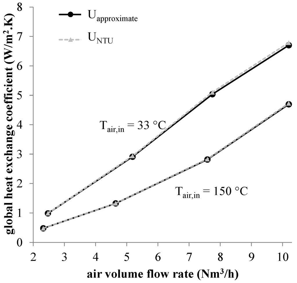 The experimental global heat exchange coefficients evaluated with Equations (20) and (26), depending on the air volume flow rate for several air inlet temperatures, are represented in Figure 10. The results are superposed, that shows the appropriateness of the NTU method to study the heat transfer through the heat exchanger, even when a radiative heat transfer from flue gas occurs and that justifies also the approximation used for the estimation of Uapproximate. The influence of the air volume flow rate and of the inlet air temperature on the global heat exchange coefficient is similar as on the thermal power exchanged (cf. Table 2). The global heat exchange coefficient is situated between 0.47 and 6.8 W/m2·K for the studied range of air volume flow rates. This low value is linked to the low air volume flow rate in the heat exchanger for a large flow section, which leads to a laminar flow of air and to a limited convective heat exchange between air and heat exchanger wall (cf. Figure 9).