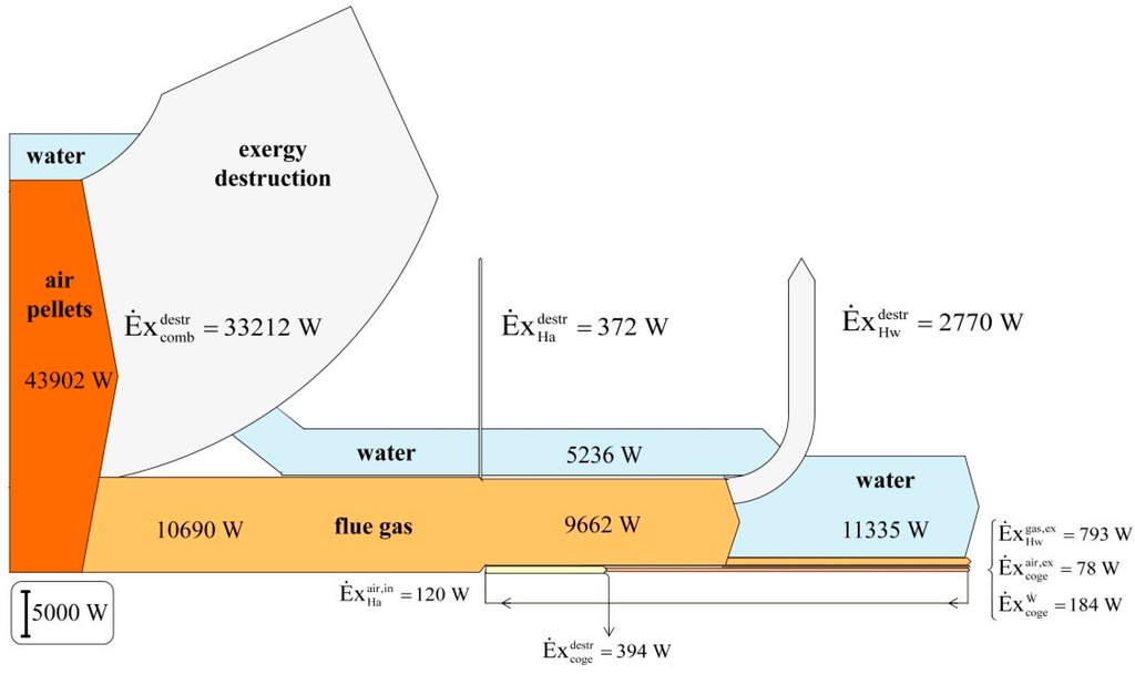 The Sankey diagram of the exergetic fluxes associated to the micro-CHP system is presented in Figure 11. The arrows associated to exergy destruction represent both recoverable and unrecoverable exergetic fluxes. The highest exergy destruction is linked to solid biomass combustion. The exergy destruction in the heat exchanger supplying the Ericsson engine is low, when compared to the exergy destruction of the water heat exchanger, mainly due to the difference in thermal power exchanged in both heat exchangers. A fraction of the exergy destruction, linked to heat transfers at the micro-CHP components walls, may be avoided by insulating the components that might enhance the exergetic performances of the system. However, from the present study, it is not possible to estimate the fraction of unrecoverable exergy (associated to entropy generation) in the exergy destruction.