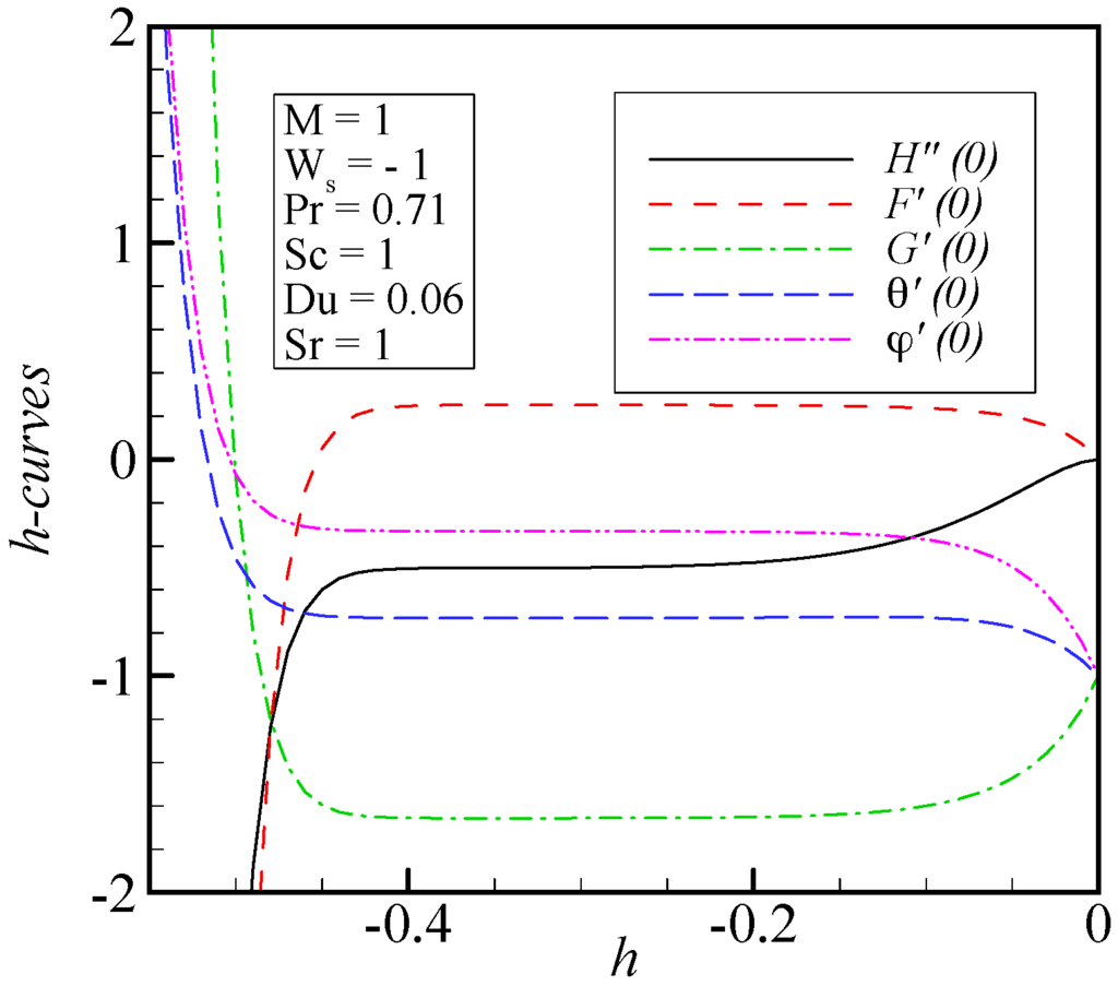 Convergence of the series in Equations (40)–(44) strongly depends on the auxiliary parameter [27]. Consider that is chosen such that the series in Equations (40)–(44) is convergent at p = 1 we have