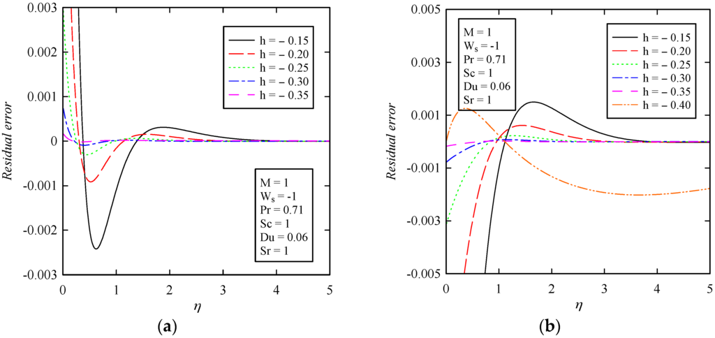 In order to check the accuracy of the method and determine the optimal values of , the residual errors displayed in Equations (64) and (65) for the 20th order approximation HAM solutions are presented in Figure 3.