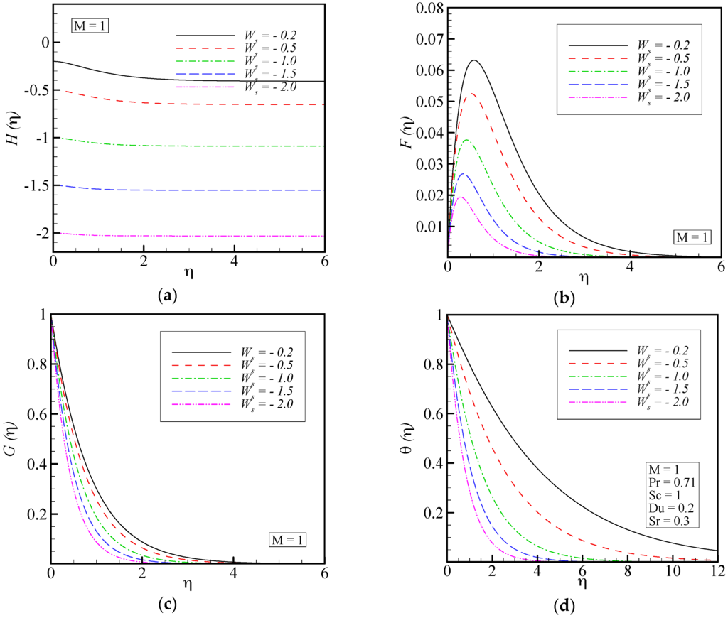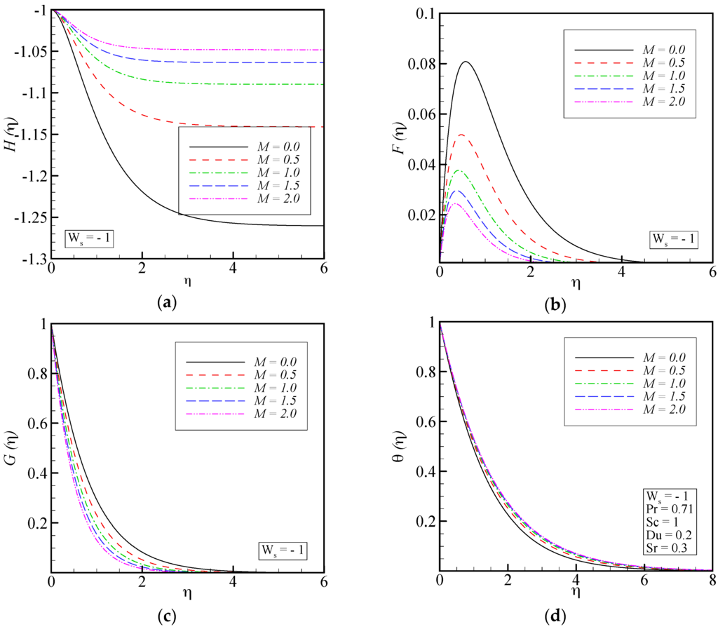 The nonlinear ordinary differential Equations (11)–(15) subject to boundary conditions (16) have been solved via HAM for some values of the magnetic interaction parameter M, Prandtl number Pr, Schmidt number Sc, Soret number Sr, Dufour number Du, and suction parameter Ws. The values of the physical flow parameters are mentioned in each of the graphs and tables. Table 1 and Table 2 illustrate a comparison between our results and those reported by Turkyilmazoglu [49] and Kelson and Desseaux [50] for and as well as different values of magnetic interaction parameter and suction parameter. Excellent agreement is observed. The diluting chemical species of most common interest have Schmidt number between 0.1 and 10.0. Thus, we chose Schmidt number 0.22, 0.64, 0.78, and 1, which represent the Schmidt number of helium, ammonia, carbon monoxide, and carbon dioxide, respectively.