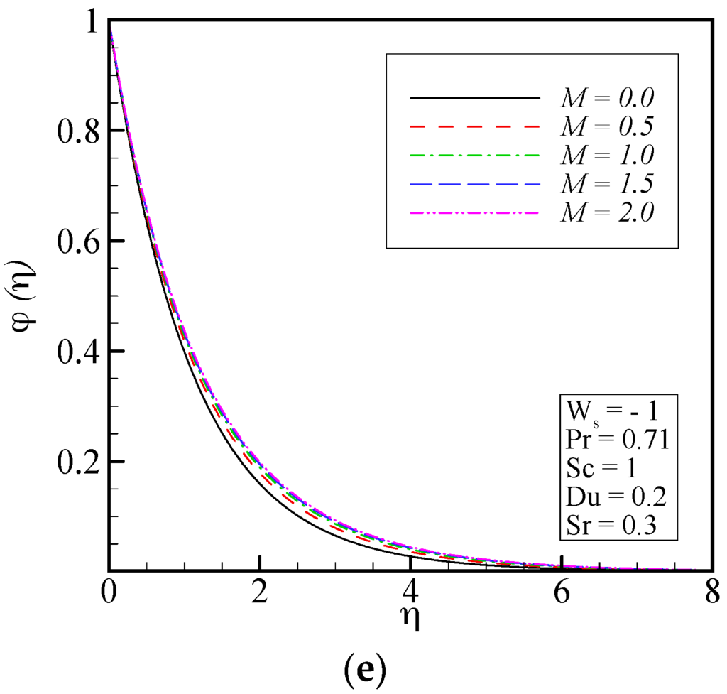 The effect of magnetic interaction parameter on the velocity components in radial, tangential and axial directions, temperature distribution as well as concentration profile is presented in Figure 4. Infliction of the vertical magnetic field to the electrically conducting fluid causes a drag-like force named the Lorentz force. This force has the tendency to slow down the flow around the disk at the expense of increasing its temperature and concentration. Thus, as the magnetic field becomes stronger, the velocity profiles in radial, tangential and axial directions decrease and the thermal boundary layer and concentration field increase. It is important to note that as the vertical magnetic field increases, increased resistance on the fluid particles applies, which causes heat to generate in the fluid.