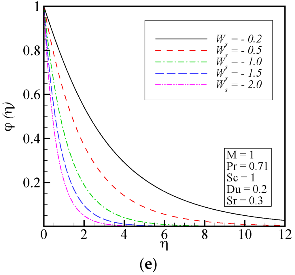 The effect of the suction parameter on all velocity components as well as temperature distribution and concentration profile is illustrated in Figure 5. When suction is applied at the disk surface, the radial, tangential and axial velocity profiles decrease. Applying suction leads to draw the amount of fluid particles into the wall and consequently the velocity boundary layers decrease. In addition, the radial velocity component becomes very small for large values of the suction parameter. The usual decay of temperature and concentration profiles occurs for larger values of the suction parameter.