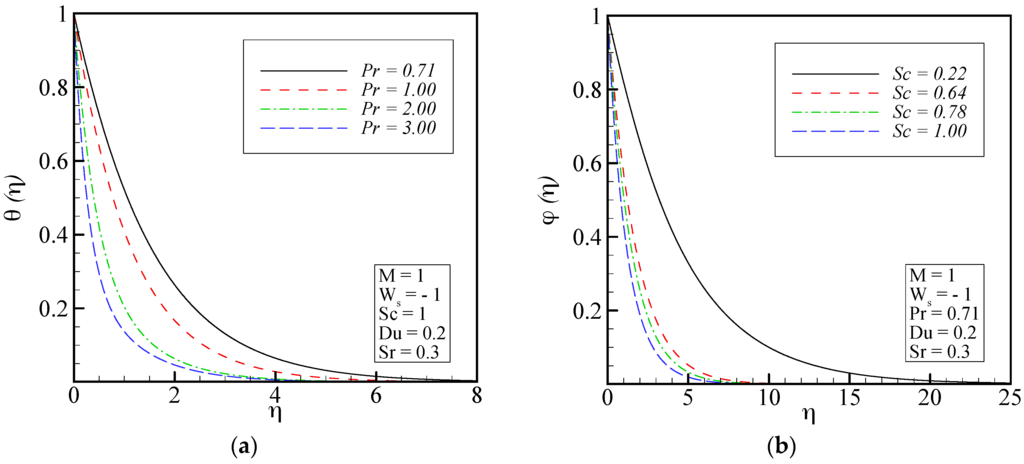 Figure 6 demonstrates the effect of Prandtl number on the temperature distribution as well as the effect of Schmidt number on the concentration profile. The thermal boundary-layer thickness decreases with increasing Prandtl number. This physically means that the flow with large Prandtl number prevents spreading of heat in the fluid. As the Schmidt number increases, the concentration boundary layer thickness decreases. In other words, molecular diffusion decreases, as Schmidt number increases.
