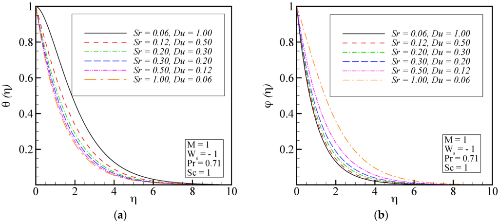 Figure 7 indicates the simultaneous effects of Soret and Dufour number on temperature distribution as well as concentration profile. The Soret effect is a mass flux due to a temperature gradient and the Dufour effect is enthalpy flux due to a concentration gradient and appears in the energy equation. It should be mentioned that Dufour and Soret numbers are arbitrary constants provided that their product remains constant [6,7,51]. Moreover, Du = 0 and Sr = 0 correspond to the condition when thermal diffusion and diffusion thermo effects are of smaller order of magnitude than effects described by Fourier’s and Fick’s laws [7,52]. The thermal boundary layer increases by increasing Dufour number or simultaneously decreasing Soret number. As the Dufour number increases or Soret number decreases, the rate of mass transfer (concentration boundary layer thickness) decreases at the disk.