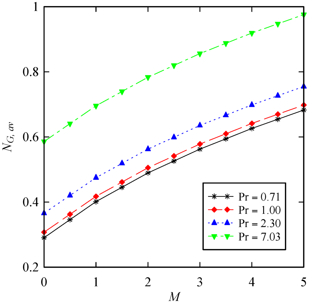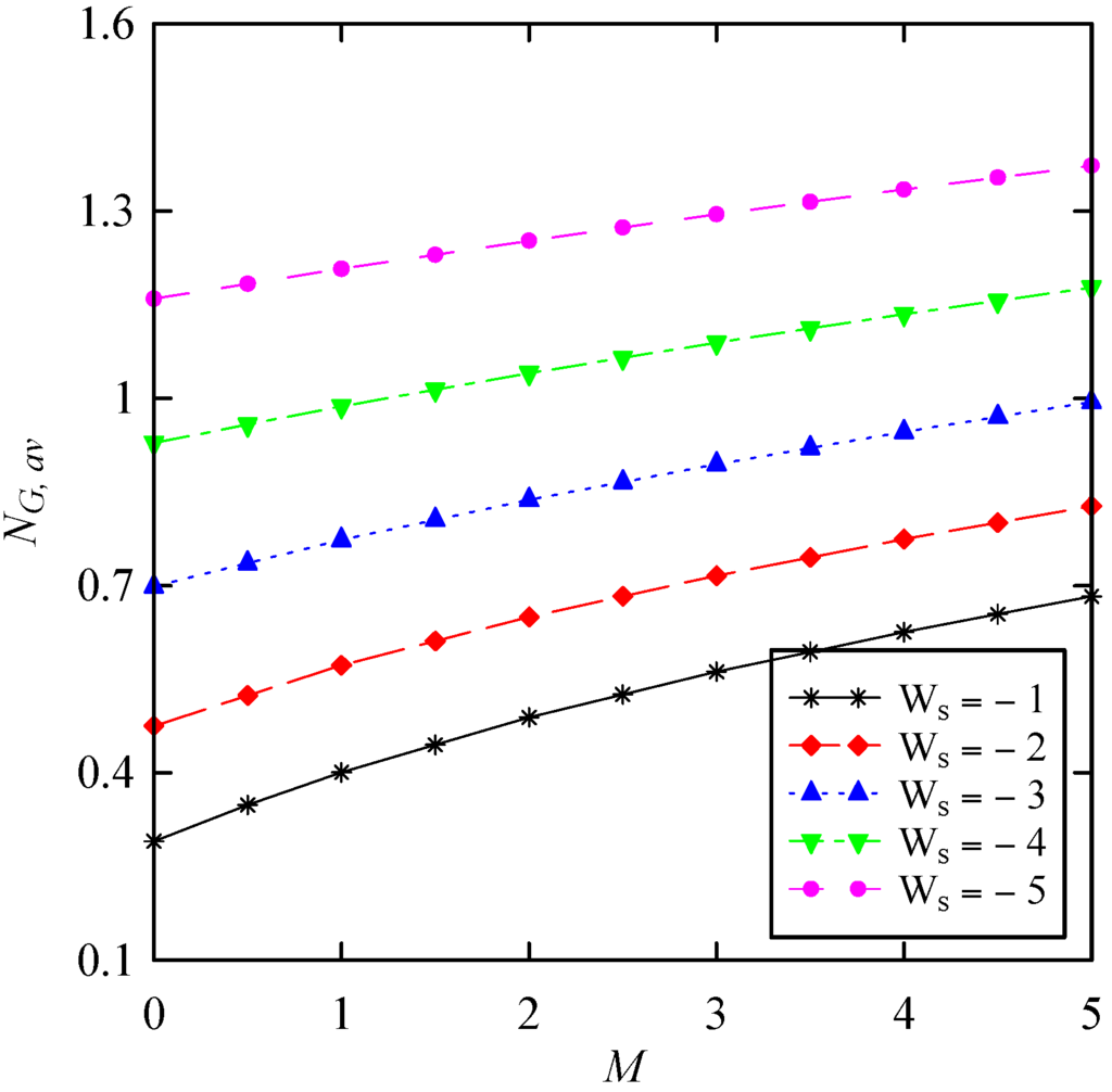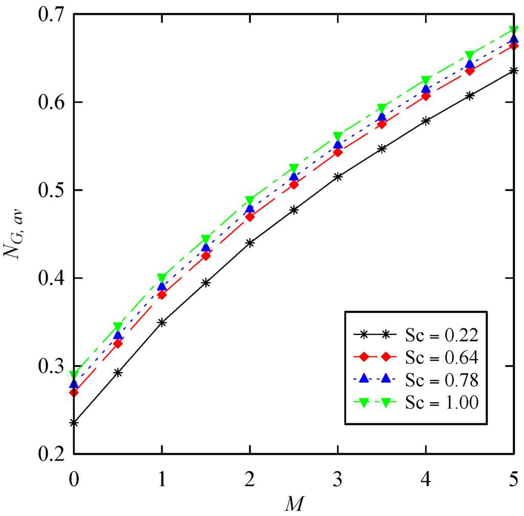 Figure 8, Figure 9, Figure 10 and Figure 11 display the averaged entropy generation number as a function of suction parameter, Prandtl number, Schmidt number, and Soret and Dufour numbers for a wide range of magnetic interaction parameter. It should be mentioned that the values of α, β and λ are chosen as unity. Figure 8 shows that as the suction through the disk surface increases, the averaged entropy generation number also increases. Moreover, increasing the Prandtl number increases NG, av (Figure 9). It is clear that Schmidt number follows the same trend as Prandtl number. From Figure 10 maximum values of the averaged entropy generation number occur when the values of both Soret and Dufour numbers are maximized simultaneously. Finally, all entropy generation related figures reveal that as the magnetic interaction parameter increases, the averaged entropy generation number also increases.