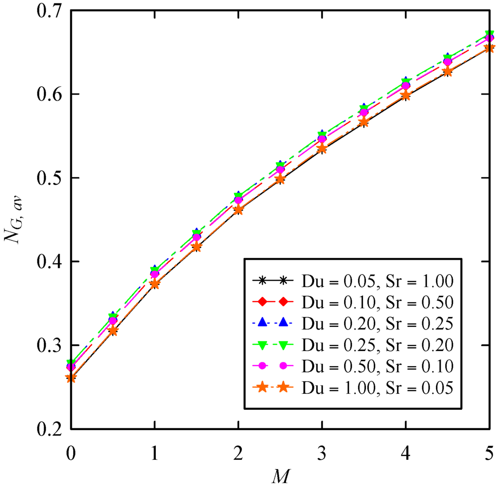 - The averaged entropy generation number increases by increasing the magnetic interaction parameter, suction parameter, Prandtl number, and Schmidt number. In addition, the maximum values of averaged entropy generation number occur when the values of both Soret and Dufour numbers are maximized simultaneously.
