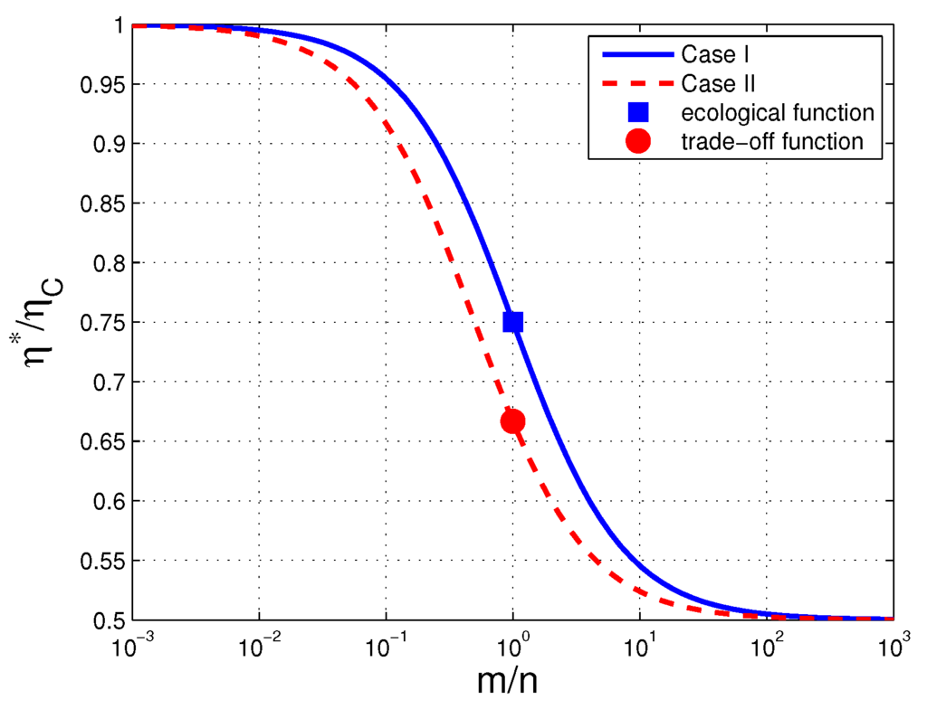 In Figure 1, we plot for Case I the rescaled efficiency at the optimized objective function as a function of the ratio (solid line, with filled square indicating the result for the ecological function).