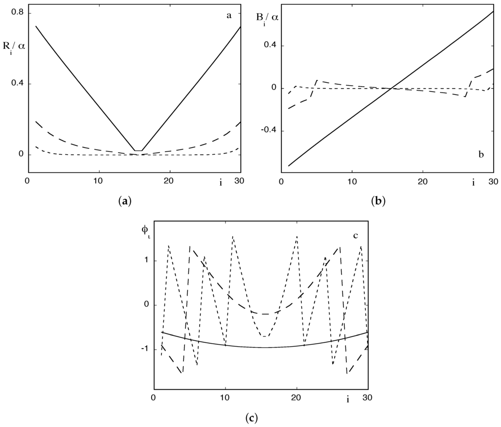 Here, and Δ are again tridiagonal matrices with elements given by Equations (6a)–(6c), where are replaced by and , respectively. is the invariant probability in absence of the periodic forcing and the forcing-induced response. Notice that and are normalized to unity and to zero, respectively. Furthermore, since in absence of the forcing all k’s are equal (cf. Equations (7c) and (3a)), the corresponding invariant probabilities are uniform, .