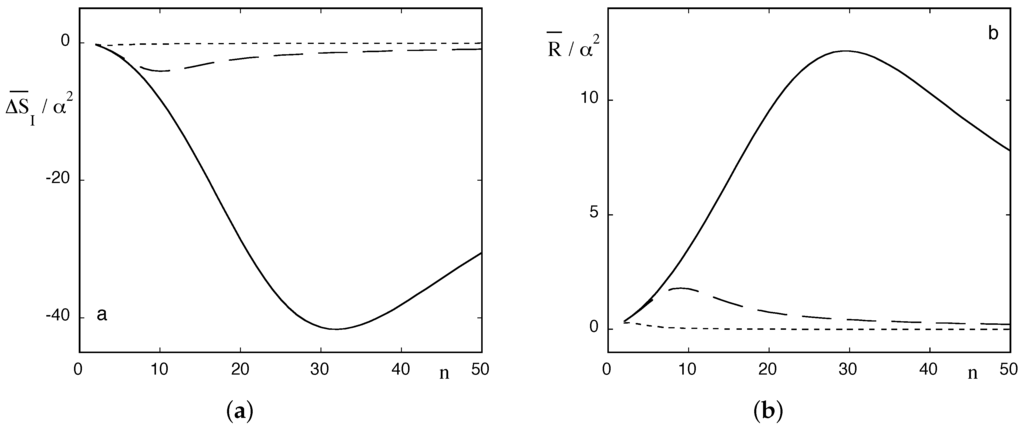 Time average excess entropy (Equation (25a)) (a) and redundancy (Equation (26)); (b) as a function of the number n of states present for different values of the ratio = 0.01 (full lines), 0.1 (dashed lines) and 1 (dotted lines). Normalization parameter α as in Figure 1.