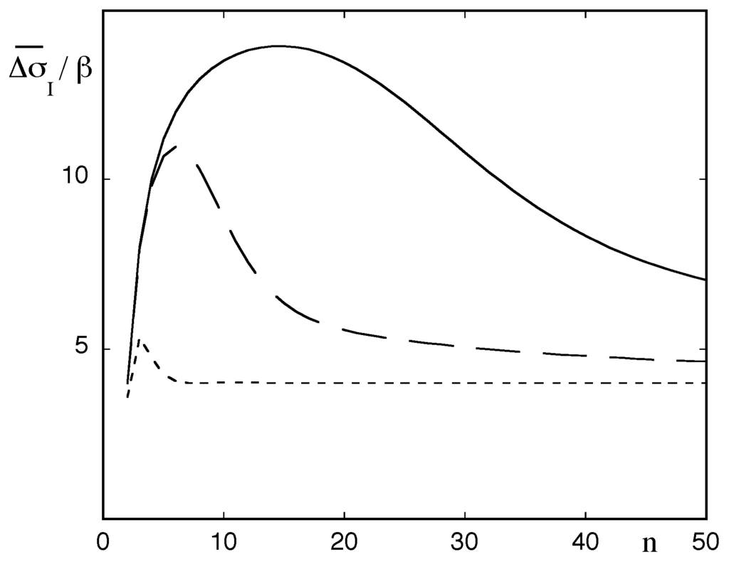 Information entropy production averaged over the period of the forcing (Equation (30)), scaled by as a function of the number of states n present and for different values of the ratio = 0.01 (full line), 0.1 (dashed line) and 1 (dotted line).