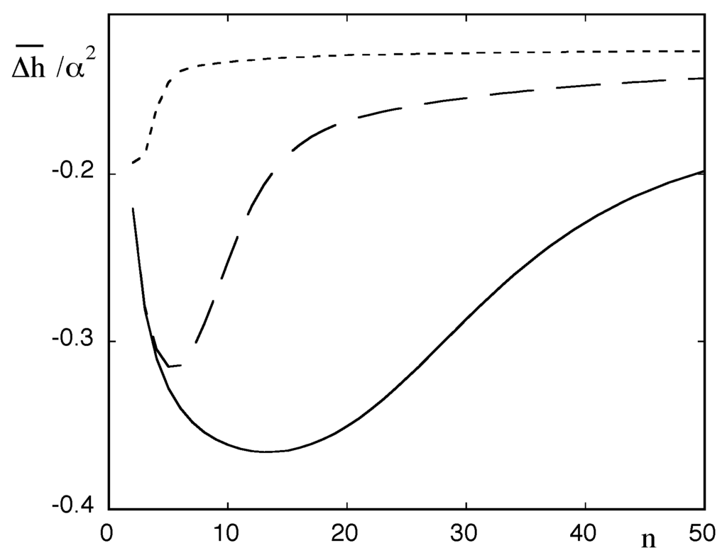 Kolmogorov–Sinai entropy averaged over the period of the forcing (Equation (35)) as a function of the number of states n present and for different values of the ratio = 0.01 (full line), 0.1 (dashed line) and 1 (dotted line). Normalization parameter α as in Figure 1.