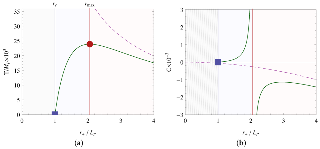 with and , that coalesce in the extremal configuration, , for . Extremal black holes are zero temperature states, a fact that is evident by analyzing the thermodynamic of Equation (8). By evaluating the black hole surface gravity κ, one obtains