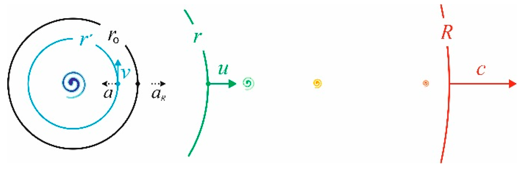 Gravitation when understood as the energy difference between the system of bodies and its surroundings, be it either way, displays itself also in Hubble’s law u = Hr, which serves to determine the distance r to a body that is receding with velocity u. The law can be rearranged by cH = c/T = aR to a scaling relation u/r = c/R. According to the general principle, the scaling relation holds likewise for an approaching body, since the gravitational force is understood, like any other force, merely as the energy difference per distance. According to this holistic tenet, the space as the physical vacuum [7,32] between galaxies is emerging, not only when the distant galaxies are moving away from us, but also when the nearby galaxies and other close-by bodies are moving toward us. Thus, to account for the zone out there r′ ≈ ro, where the body is neither receding nor approaching the scaling relations for velocity and acceleration can be rewritten as [7]