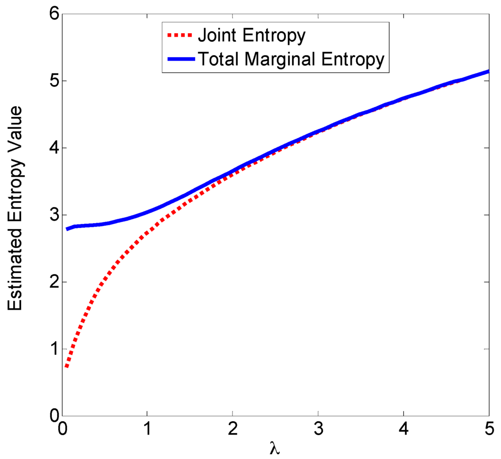 Figure 2 shows the scatter plot of the samples. Based on these samples, we evaluate the joint entropy and total marginal entropy using Equations (44) and (45), respectively. The estimated entropy values with different