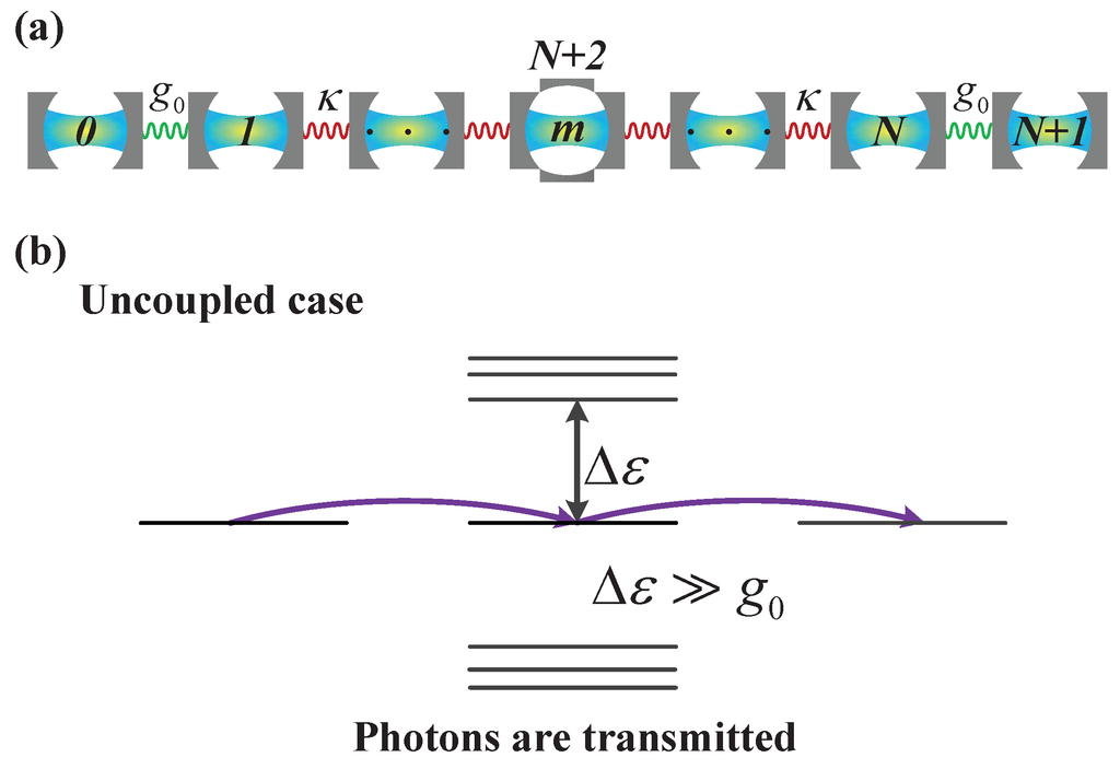 (color online) (a) Two remote resonators, labelled 0 and , are coupled to the ends of a coupled-resonator chain of N resonators with , the coupling strength between the two boundary resonators and the intermediate chain, and κ, the coupling strength between the intrachain elements. To achieve multiphoton transport, we introduce an auxiliary resonator, labelled , to interact with the m-th resonator of the intermediate chain, with strength ; (b) In uncoupled case of , the intermediate chain could, under the assumption that , coherently couple the two spatially separated resonators, such that photons are transported between the two boundary resonators after the time evolution; (c) However, when , the boundary resonators are decoupled from the intermediate chain owing to the large detunings. In this case, photons are reflected back and remains unchanged.