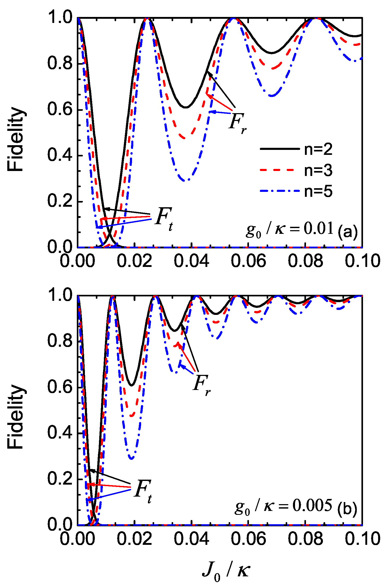 In Figure 2 we plot the transmission fidelity versus with (see Figure 2a), or (see Figure 2b), as well as the reflection fidelity . In the two cases, we assume that a Fock state is initialized into the left boundary resonator, and further take and 5 as three special examples to simulate numerically. It is shown that as , we obtain while , implying that photons are transmitted from the left resonator to the right resonator. In contrast, in the regime , photons are reflected back to the left resonator, according to whereas . Hence, a Fock state could, by tuning the coupling strength , be transmitted forward or reflected backward at will.
