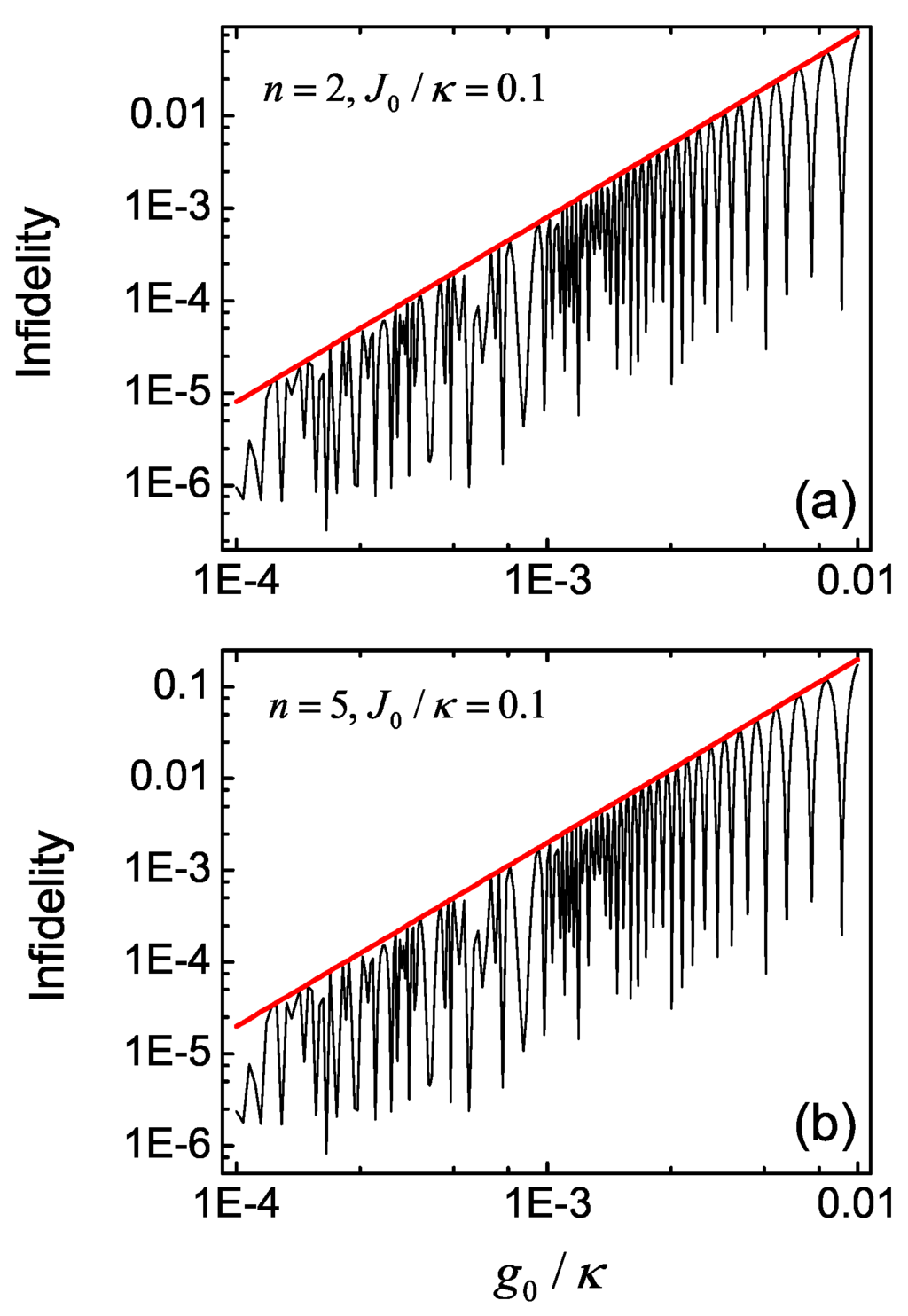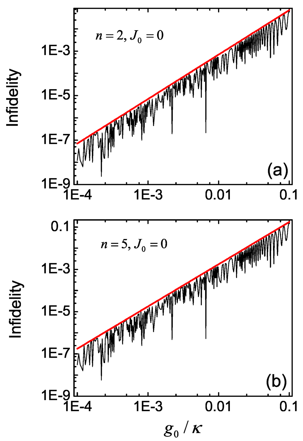 (color online) Numerical results of the transmission infidelity, , as a function of with either (a) or (b) in the uncoupled case of . The analytic upper bounds are represented by the bold red lines. Here, the evolution time and we choose , .