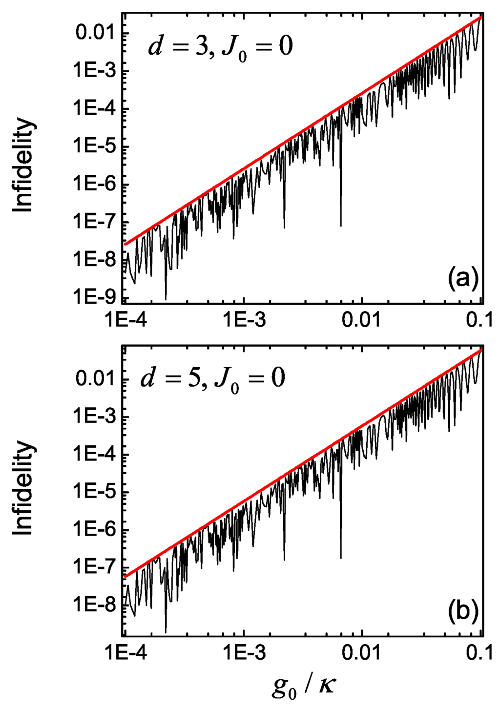 (color online) Numerical results of the average transmission infidelity, , as a function of with either (a) or (b) in the uncoupled case of . The analytic upper bounds are represented by the bold red lines. Here, the evolution time and we choose , .