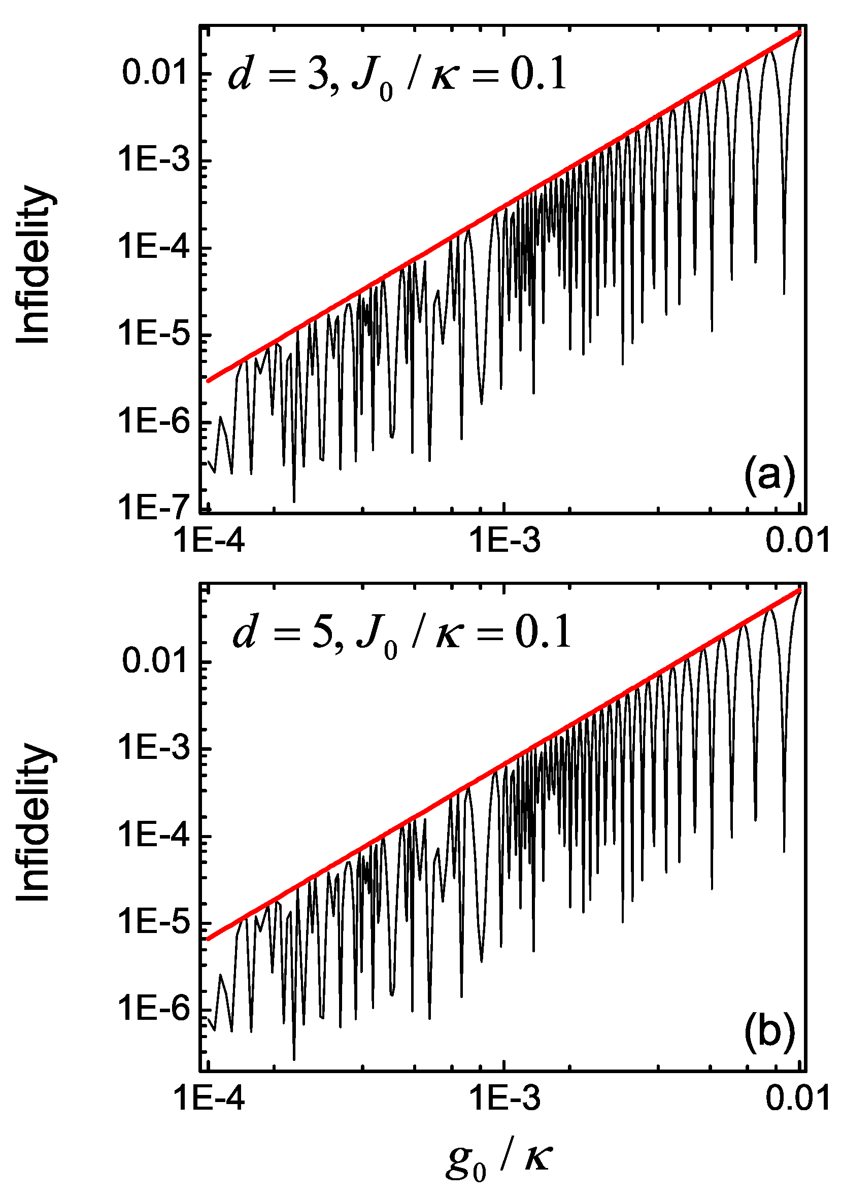 To confirm our calculation of quantum information leaking into the off-resonant couplings [57], we compare numerical results of the transmission infidelity to the analytical upper bound as depicted in Figure 3, as well as the reflection infidelity in Figure 4. It is found that this upper bound is in excellent agreement with the numerical results. In addition, the leakage of quantum information decreases with deceasing , so that this leakage can, in principle, be made arbitrarily small.