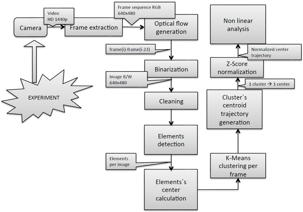 The recording took place for 1.5 h every day, and approximately in the middle of that period a stochastic event consisting of a hit on the tank was introduced. The images to be processed consisted of a 3.5-min video clip containing the response to the event (Figure 1).
