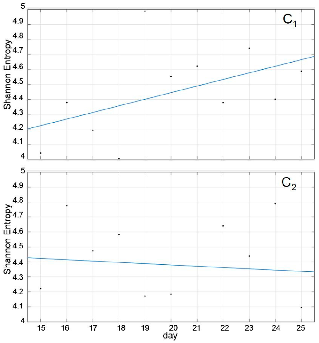 Shannon entropy (SE) values for C1 (Control, n = 26 fish, upper figure) and C2 (MeHg-exposed, n = 19 fish, lower figure) during the 11 days immediately after the removal of the MeHg (X-axis, from the 15th to the 25th day). The lines represent a first-order polynomial fitting of the single SE values measured daily and are intended to serve solely as a rough indication of the SE evolution trend.