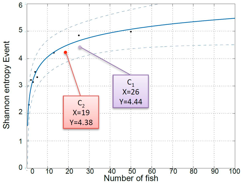 Methods based on the non-invasive monitoring of alterations in fish behavior and responses have shown their potential to indicate the influence on fish systems of stressors such as high density [,], exposure to hypochlorite [], hypoxia, feeding regime [], human drugs [], and MeHg []. Implementation in aquaculture of these biological warning system (BWS) methods, could help to achieve the on-line quality and safety monitoring of farmed fish and aid in the certification of fish welfare practices [,]. The application of BWS concept as a monitoring method [] is particularly interesting when dealing with unexpected and/or novel contaminants, as was the case of melamine contamination in foods and feeds that caused thousands of deaths and was found to contaminate fish feed also []. The analytical techniques for the detection of some highly relevant contaminants—in particular, environmental pollutants such as polychlorinated biphenyl (PCB) and dioxins, heavy metals, and human and veterinary medicines—are very specific, usually require sophisticated equipment and specialized personnel, and are relatively costly [], which hardly makes them suitable for their implementation within routine monitoring activities. On the other hand, it would be a great advantage to implement non-invasive monitoring methods capable of detecting deviations from the normal behavior that could serve as indicators of alterations affecting the fish. The application of BWS to fish farming requires the conceptualization of fish farming itself as a system subject to monitoring and modeling, identification of its “optimal operational point”, which in this case refers to the Shannon entropy (SE) value measured under optimal conditions for the European seabass system, and the measurement of its “actual operation point”, which is the current or measured SE value of the system, to detect potential deviations. It is to be expected that deviations from the norm will take place when negative alterations are introduced, but possibly also when those alterations induce an improvement on the animal’s quality of life.