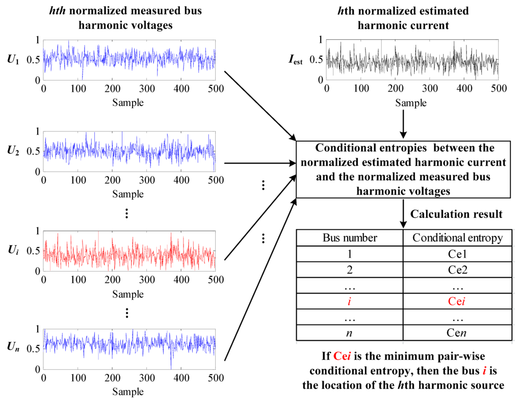 The stronger the correlation between the two random variables, the smaller their conditional entropy is. Owing to the current division effect between branches, the injected harmonic current has minimum conditional entropy with the voltage of its injected bus, compared with the conditional entropies with other bus voltages. Thus, The minimum pair-wise conditional entropy can be used to determine the harmonic source location, where is the normalized estimated harmonic current, and is the normalized measured bus voltage. The principle of harmonic source localization based on the minimum pair-wise conditional entropy is shown in Figure 2.
