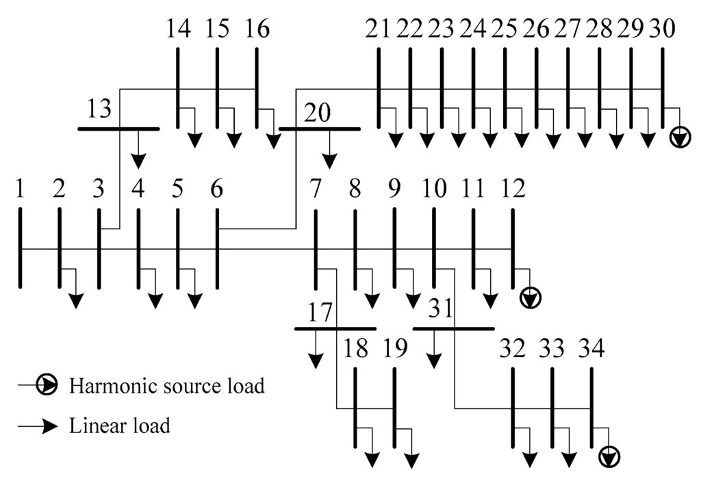 The IEEE 34-bus power system [] as shown in Figure 4 is selected as the test system, with the system parameters listed in the Appendix.