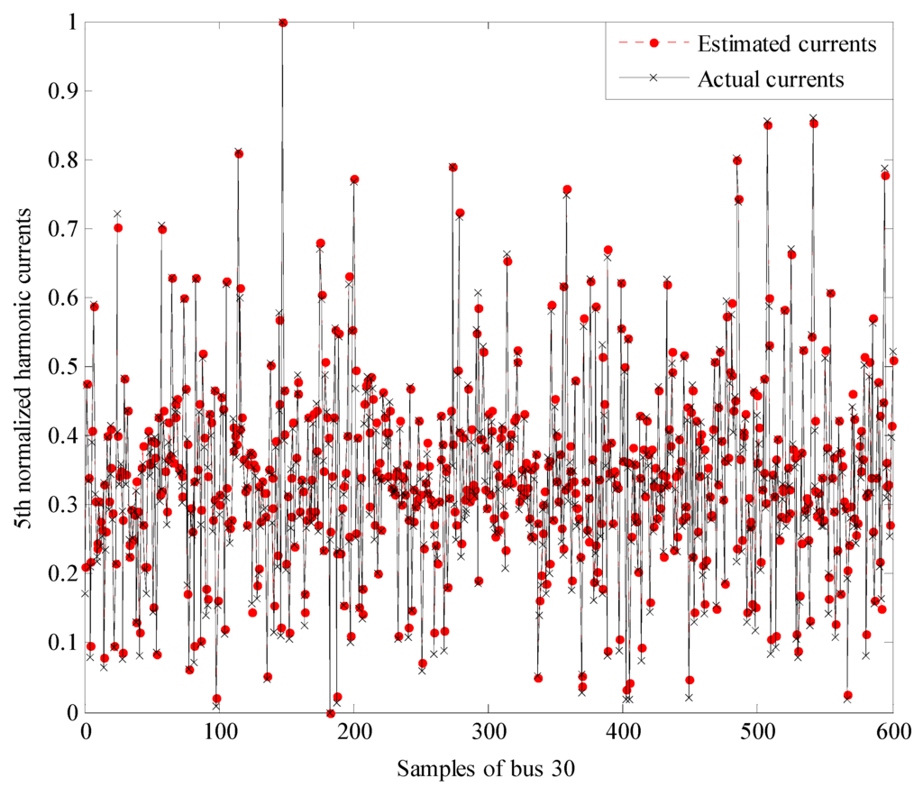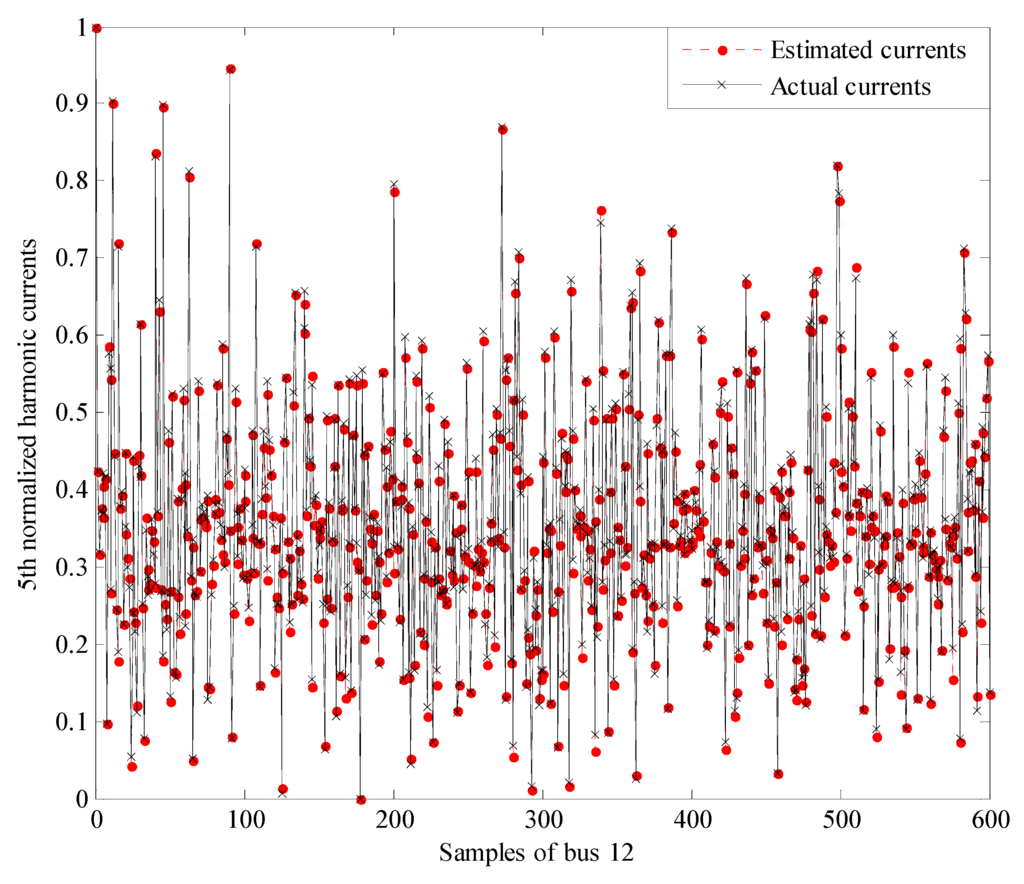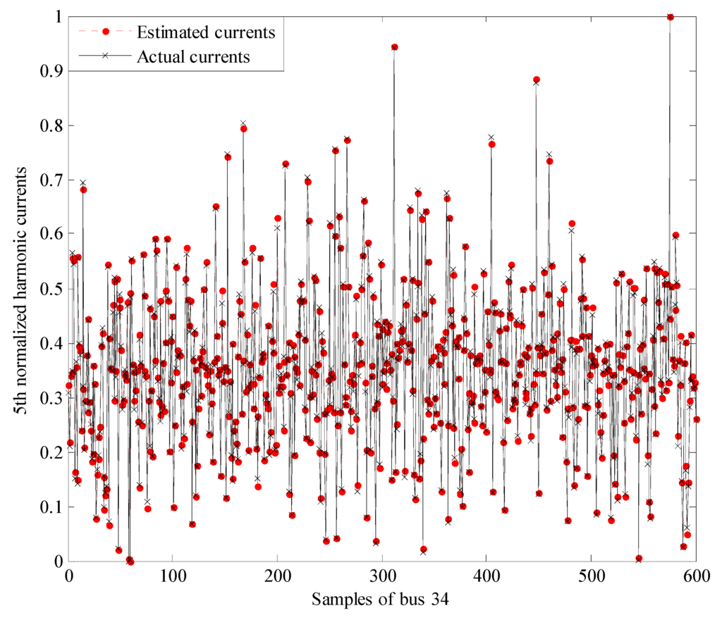 Based on the FKEO-ICA algorithm, the comparisons of normalized actual and estimated harmonic currents of bus 12, 20, and 34 at h = 5 are shown in Figure 5, Figure 6 and Figure 7, which indicate that the estimated harmonic currents are highly consistent with the actual harmonic currents.