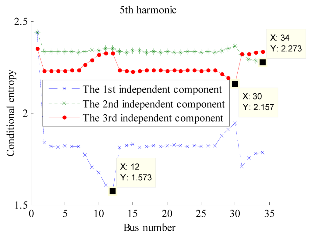 As indicated in Figure 8, Figure 9 and Figure 10, although the orders of the estimated independent components (i.e., estimated harmonic currents) are random, the harmonic injection bus can be accurately identified when its voltage exhibits the minimum conditional entropy with the estimated harmonic currents.