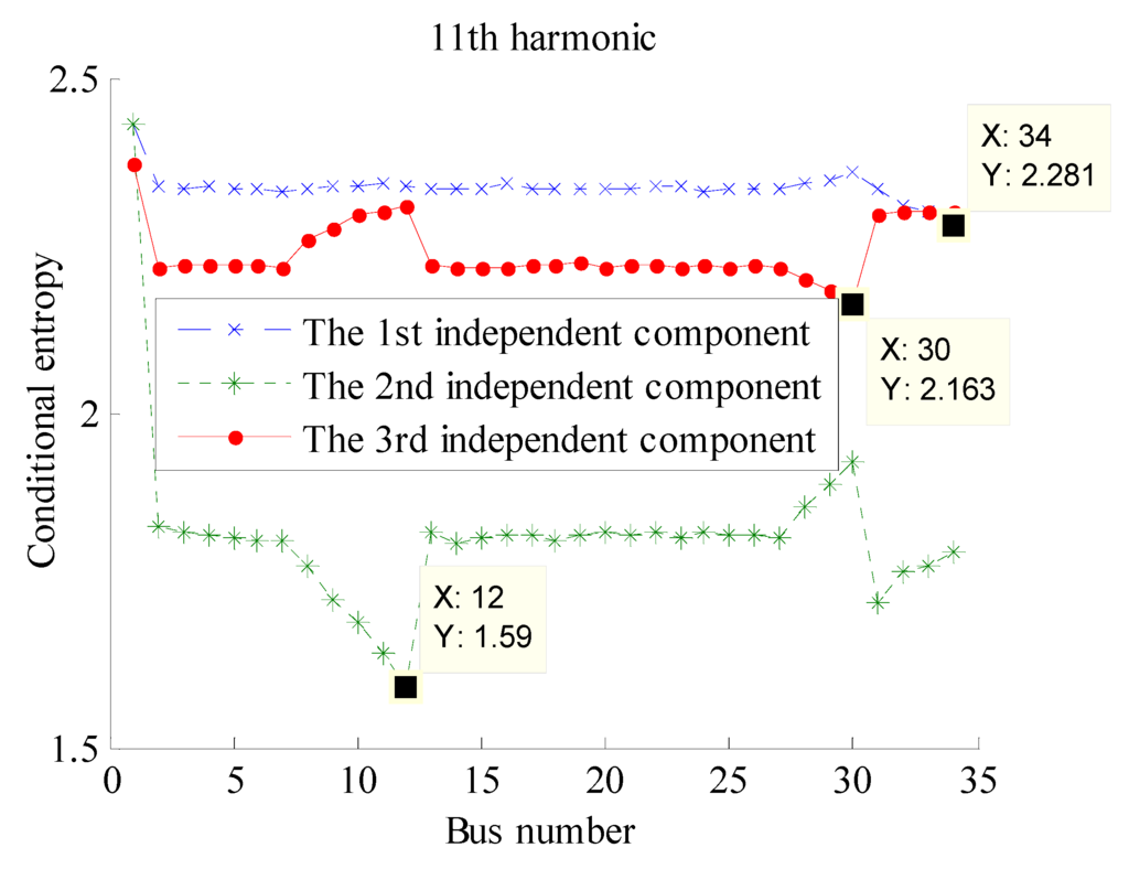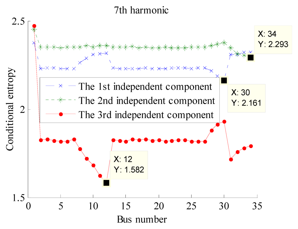 Similar to other ICA methods, FKEO-ICA is not capable of determining the exact bus of harmonic sources. The relationship between the harmonic currents and the bus voltages is , which indicates that the injected harmonic current produced by the harmonic source at the injected bus has a certain correlation with the bus harmonic voltage . As a consequence, the bus harmonic voltage and the injected harmonic current can be considered as two random variables with associated distributions. In accordance with the information theory [,,], the conditional entropy has been employed to measure the correlation between two random variables in case one of them is known. The pair-wise conditional entropy between the estimated harmonic current and the measured bus voltage at each frequency can be expressed as follows: