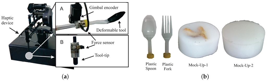 The data collection setup and the samples for dataset extraction. (a) data collection setup: A is the end effector for deformable tools. B is the end effector for deformable object with a rigid tool; (b) the four samples used for establishing the datasets. The left two are the deformable tools; a spoon and a fork. Both are made of elastic material. The right two are the deformable mock-ups made of silicone. Mock-up-1 has a harder inclusion inside.