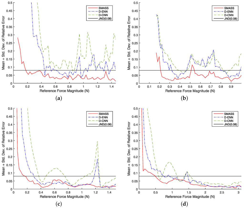 - SMASS selects a high number of representative points when the reference stimulus is low, while it selects a low number of points when the reference stimulus is high, which fits well to the human perception characteristic: stimuli difference in small magnitude is more prone to be detected than that in large magnitudes, e.g., humans can detect the difference between 0.3 N and 0.5 N but cannot do it between 30.3 N and 30.5 N (see Section 5 for more details).