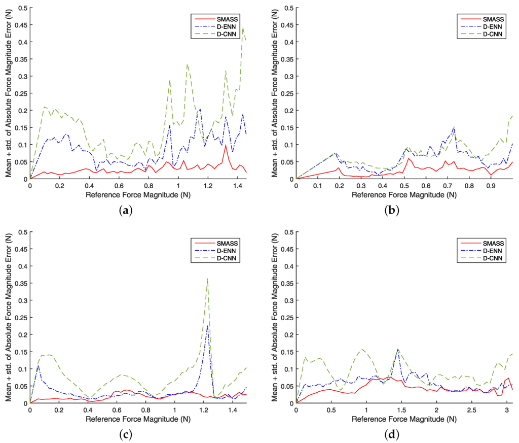 Mean plus standard deviation of the absolute force magnitude error. (a) spoon; (b) fork; (c) Mock-up-1; (d) Mock-up-2.