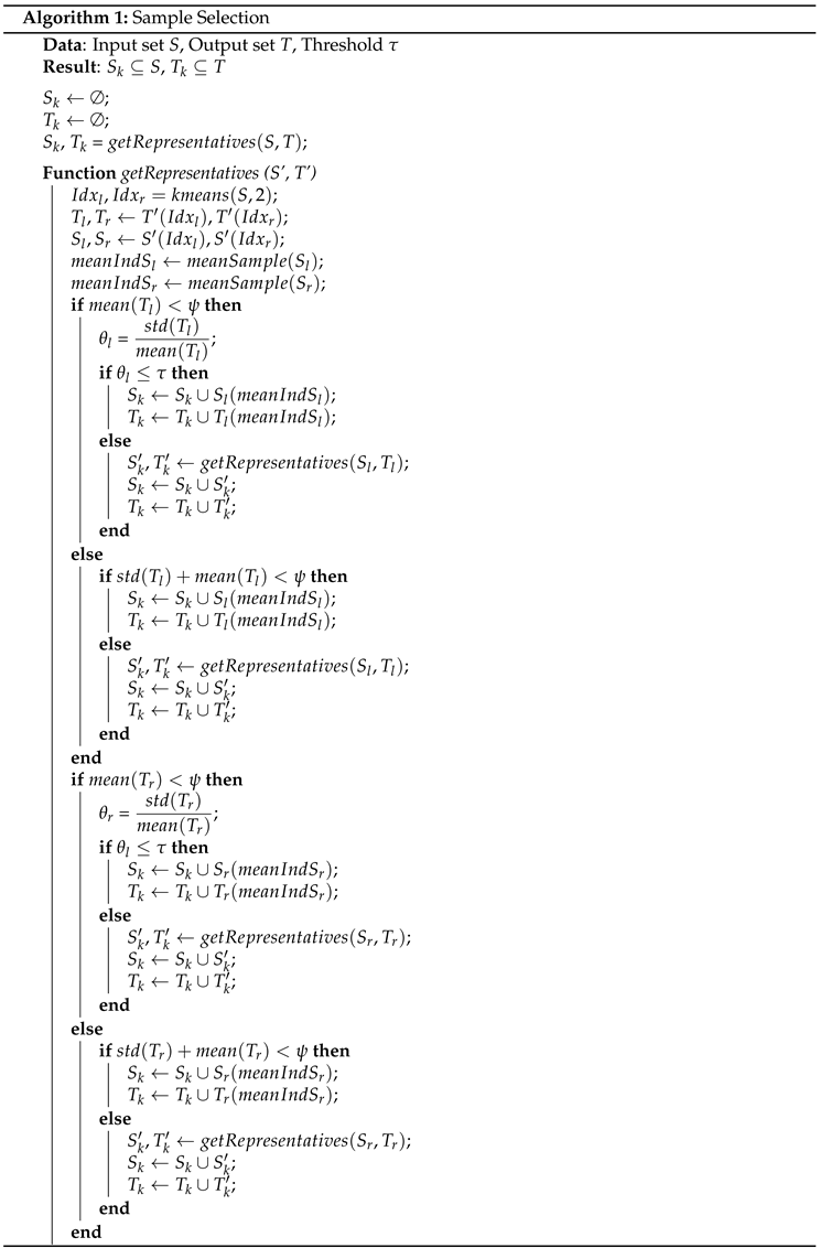 In this work, we redesigned the BSP-KM to find the optimal number of representative pairs from S and T, that are conditioned by Equation (1). The algorithm starts with partitioning the input space into two sets using the k-means clustering technique. In accordance to the sample indexes in each group of , the algorithm classifies the elements of the set . Afterwards, the mean and standard deviation are calculated for each . If the ratio of the standard deviation to the mean of the group is less or equal to the threshold value τ, the element closest to the mean of each cluster in and the corresponding element from of the leaf are marked as a representative pair. Otherwise, the algorithm continues to split the leaf recursively. The algorithm stops partitioning when all leaves from meet the above mentioned condition. The final step is the traversal of the tree and extracting the marked pairs. Thus, in the form of representative pairs, we select a subset of the overall dataset. Algorithm 1 shows the pseudo code for the proposed algorithm.