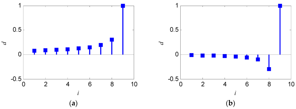 Weights of the original data in r-AGO: (a) r = 0.3, k = 9; and (b) r = −0.3, k = 9.