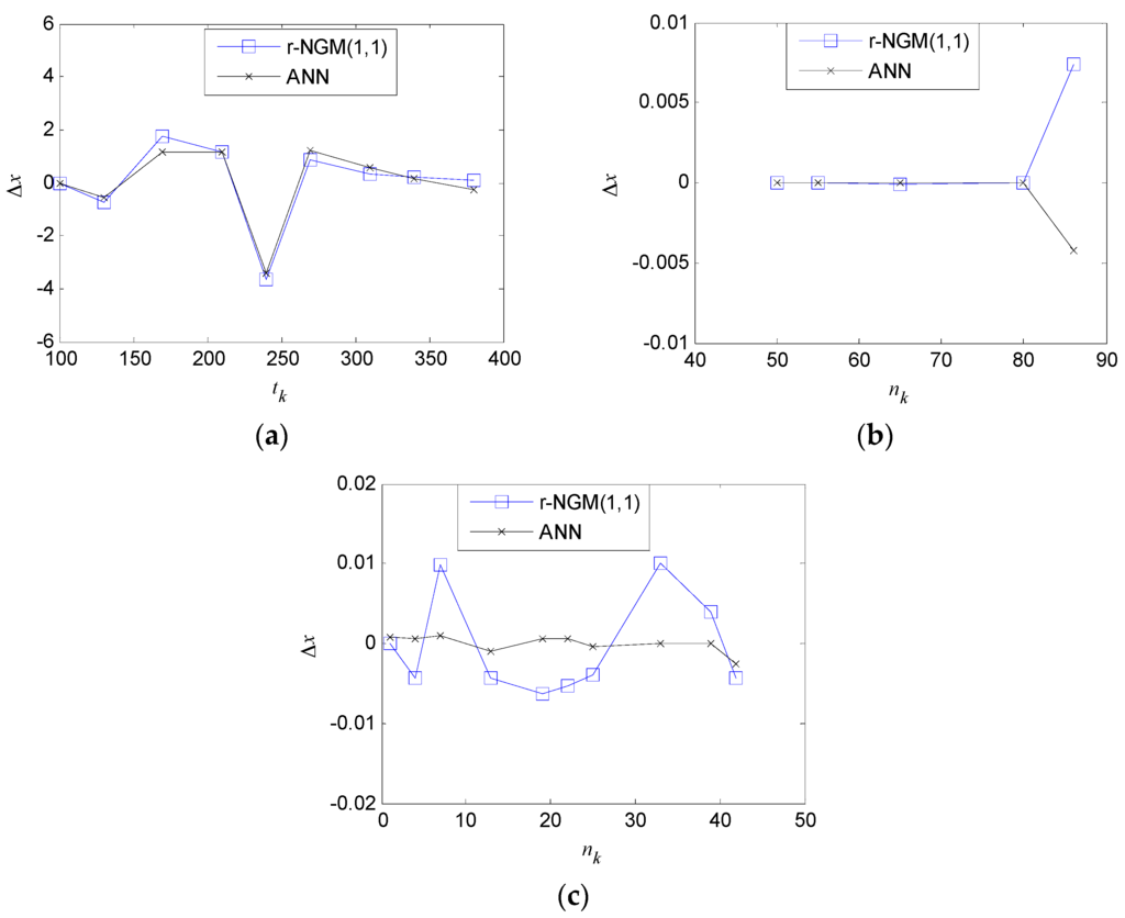 An artificial neural network (ANN) [32] is employed to compare with the proposed r-NGM(1,1) in this paper. Figure 4 shows errors Δx between the original and estimated values obtained by two models, and their comparison results are listed in Table 8. A three-layered ANN is used to predict the non-equidistant sequences, consisting of an input layer, hidden layer, and output layer. The number of neurons in the hidden layer is chosen empirically by adjusting the number of neurons until the effective number of parameters reaches a constant value.
