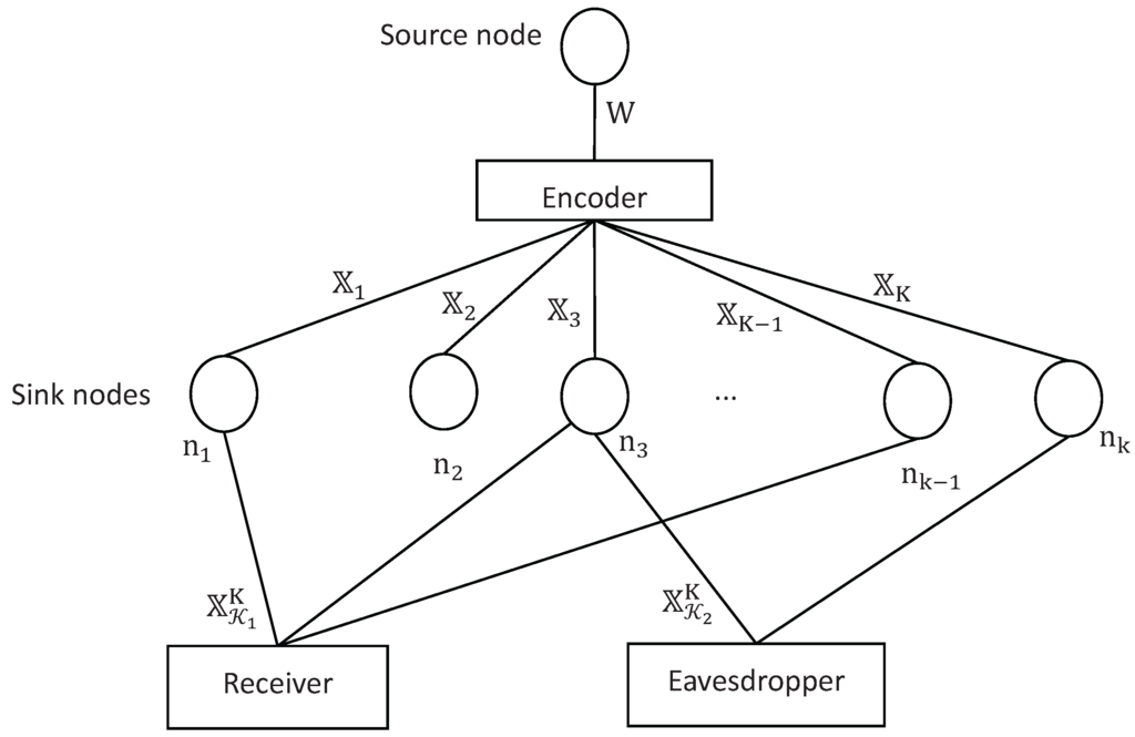 The communication model of wiretap network with K sink nodes, depicted in Figure 2, consists of four parts, namely encoder, network, receiver and eavesdropper. The formal definitions of those parts are introduced in Definitions 1–4, respectively. The definition of achievable transmission rate is given in Definition 5.