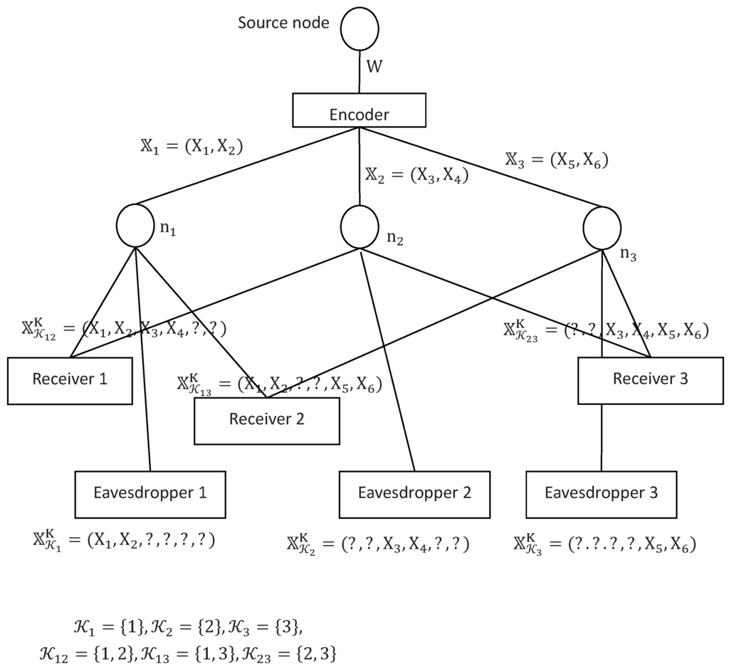 To have a clearer idea on the notations defined in this section, a special example of wiretap network is given in Figure 3 with