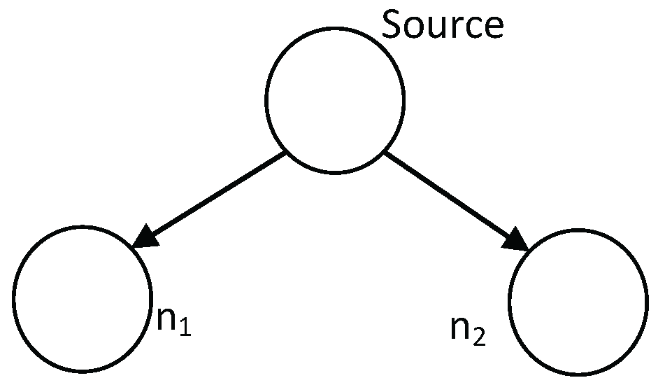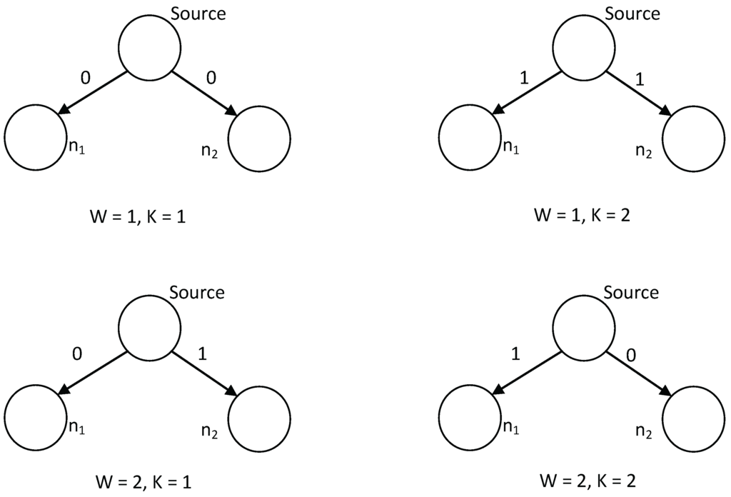 Furthermore, a new level of information theoretic security was defined as weakly secure network coding [], in which adversaries were unable to obtain any “meaningful” information about the source messages. The weak security requirements could also be satisfied when the number of independent messages available to the adversary was less than the multicast capacity. Ho et al. [] considered the related problem of network coding in the presence of a Byzantine attacker that could modify data sent from a node the the network.