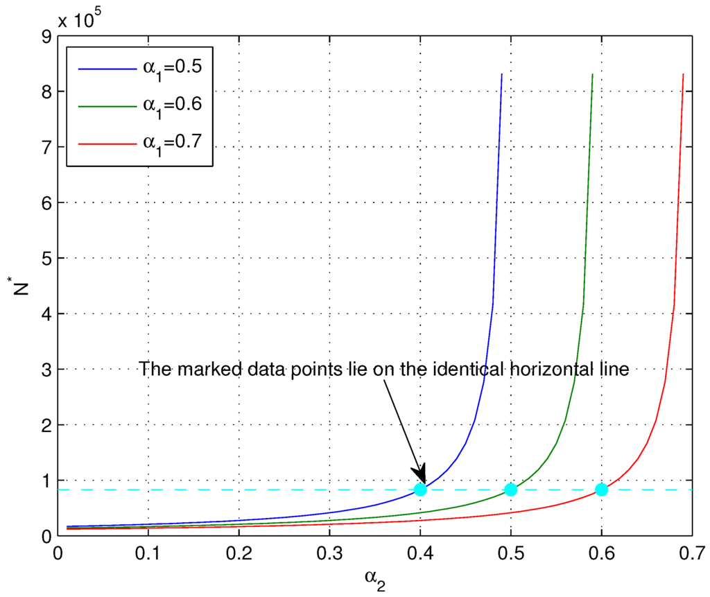 After the discussion above, it has been known that the major advantage of the coding scheme in this paper is that there exists a pair of encoder and decoder such that the source message is transmitted to the legitimate receivers with exactly one time of transmission, when the number K of sink nodes is sufficiently large. More precisely, denoting by the minimal value of N satisfying Equations (44)–(47), when and ϵ are given, the number sink nodes K should be at least to implement the one-time transmission. The values of versus and is given by Figure 6. The figure shows that when , the value of is totally determined by the value of . As a concrete example, the data points marked in Figure 6 are those with and they lie on the identical horizontal line and hence share the same value of .