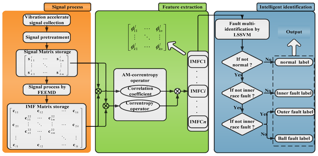 Before extracting the fault features of roller bearings, the state parameter should first be extracted. Some fault features can be expressed in state parameters, such as the axial temperature and rotor current. However, these state parameters are similar in that they can only diagnosis the late and serious faults. In order to find the early faults of the bearings in order to keep the devices safe, some roller bearing state parameters such as vibration acceleration and ultrasonic waves have been used [6]. In considering that the ultrasonic wave is easy to be interfered by noise, this welcomed extracting technique currently refers mainly to the measurement of vibration by suitable transducers [7]. However, it is difficult to extract characteristic information directly from the vibration signal of roller bearings which are non-stationary, non-linear, and which often feature strong noise interference [8]. The general way to extract fault features is based on adaptive time frequency transformations. Empirical Mode Decomposition (EMD), proposed by Huang [9], is a typical adaptive time-frequency decomposed method which is affected with the mode mixing problem [10]. To solve the problem, Huang has put forward the detection interrupted method [11], which is a kind of posteriori judgment that has many limitations. Ensemble Empirical Mode Decomposition (EEMD) is another method to eliminate the mode mixing problem which has been proposed by Wu in 2009 [12]. This approach adds white noise data onto the primary signal, applying the uniform distribution character of the white noise frequency spectrum to make up for the absence of the signal scales. Meanwhile, the characteristic zero-mean statistic of white noise is employed in order to remove the added noise influence, so that the decomposed result can be better than the single EMD algorithm. However, many groups of white noise and many EMD processes increase the computation complexity of EEMD. Furthermore, the real-time calculation of EEMD may be influenced if the program structure is confused. To improve the computation efficiency of EEMD, many researchers have tried various approaches [13,14]. Among all the studies, Wang [15] has analyzed the computing intensity of EMD and EEMD and verified that the computational complexity depends on the data length. Based on the computational evidence he has concluded that the EEMD time cost can be shortened as Fast EEMD (FEEMD). The improved effect of FEEMD has been applied on wind speed forecasting [16]. In terms of Intrinsic Mode Function (IMF) features, although the combination of EEMD and information theory has been a hot research topic in recent years [17,18], it pays little attention to the attempt of considering cross correlation information as fault features. Among the cross correlation measures, Correlation Function (CF) as a time structure similarity measure has been widely applied in signal processes such as statistical analyses [19,20] , trait associations [21], and so on. However, CF is limited to reflect two order moment statistical traits between two signals only, and furthermore, its ability to analyze non-Gaussian and nonlinear signals cannot avoid severe attenuation [22]. Correntropy, which was advanced by Santamartía in 2006 [23], is a generalized correlation measure which contains even order moment statistical information. More detailed correlative information demonstrates that correntropy is more sensitive and the implementation of the kernel function can be more appropriate means in which to deal with high dimensional nonlinear signals than CF [24]. Because of these properties, in recent years, correntropy has been further studied in different subject fields, such as time series modeling [23], nonlinearity testing [24], feature selection criterion [25], hyper spectral immixing [26], gross error detection [27], medical signal processing [28], and so on. To achieve state identification, the Support Vector Machine (SVM) method has been widely employed in the machine learning community because of its distinctive generalization ability compared with that of other conventional methods, such as the neural network method [29]. Built on the foundation of the SVM algorithm, the Least Square Support Vector Machine (LSSVM) method possesses not only as good of a generalization ability as the general SVM method, but a better learning ability for small samples than the general SVM method. In addition, the calculation speed of LSSVM is faster than SVM based on the same identification accuracy [30] That is why LSSVM is prevalent in many fields related to pattern recognition [31,32].