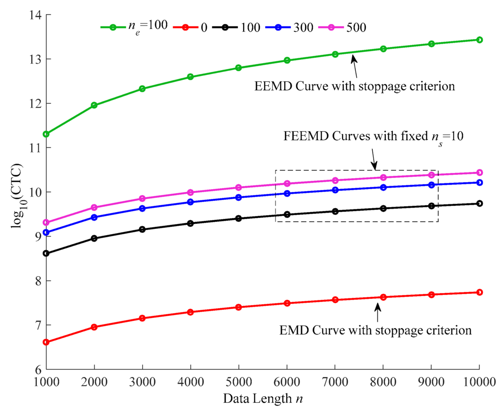 Practically, Wang [15] has proven that the computing process of EMD and EEMD is not intensive and tedious. It has been demonstrated that the computational time complexity (CTC) of EMD is no greater than ns·(41·n·m), which is proportional to shifting time ns, IMF dimension n, and signal length m, and the CTC of EEMD is no greater than NE·ns·(41·n·m), which is proportional to the EMD CTC and ensemble time ne respectively. Generally, getting ne by SD stoppage criterion costs at least 5m CTC. The fast EEMD (FEEMD) algorithm indicates that the fixed value of ns can perform better than the ns obtained by other stoppage criteria. Furthermore, it has been summarized by Wu [12,36] that to get better decomposed results the assignment of ns should generally be 10. Taking ns and ne as constants, the CTC of FEEMD can be described as T(m) = O(m·logm) [15], where n = log2m for EMD is performed as a dyadic filter bank [36]. Nevertheless, using the SD criterion the CTC of EEMD is no less than 205·ne·m2·log2m = O(m2·logm). The theoretical curve of the relationship between log10(CTC) and data length m is shown in Figure 2.